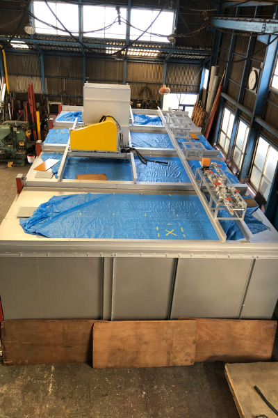 乾燥炉及びファン架台を製作・設置までいたしました。 扉にのぞき窓や天井部に爆発口などの開口部もあり、扉には丁番や取手を付けたりと多くの細工を施しました。 乾燥炉は室内が高温になるため扉や天井部・壁もすべて中に断熱材を入れてあります。 断熱材を入れるのも溶接で閉じてしまうと中の断熱材を痛めてしまうので、断熱材を入れてからリベットで閉じております。 一体で作ってしまうと運搬できない大きさになってしまうので、壁も天井も分割してボルトで組立構造にて製作いたしました。 レベルを出して設置したところ、床が平ではないため壁と床に隙間ができてしまい熱が逃げてしまうので、モルタルにて隙間を埋めるまで行いました。