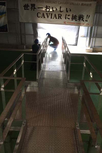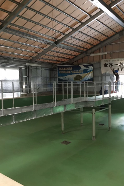 製作自体は問題なく製作できましたが、現地施工時に搬入経路で一段上がらなければならない場所があったので一苦労しました。 施工時は水槽内は水も入っていなかったのでチョウザメが泳いでいるのを想像もできなかったですが、別件で現場に行った時にチョウザメが歩廊の下を泳いでいて感動しました。 普段行かないような場所や、普通は入れないような場所に入れるのもこの仕事の特権だと思います。